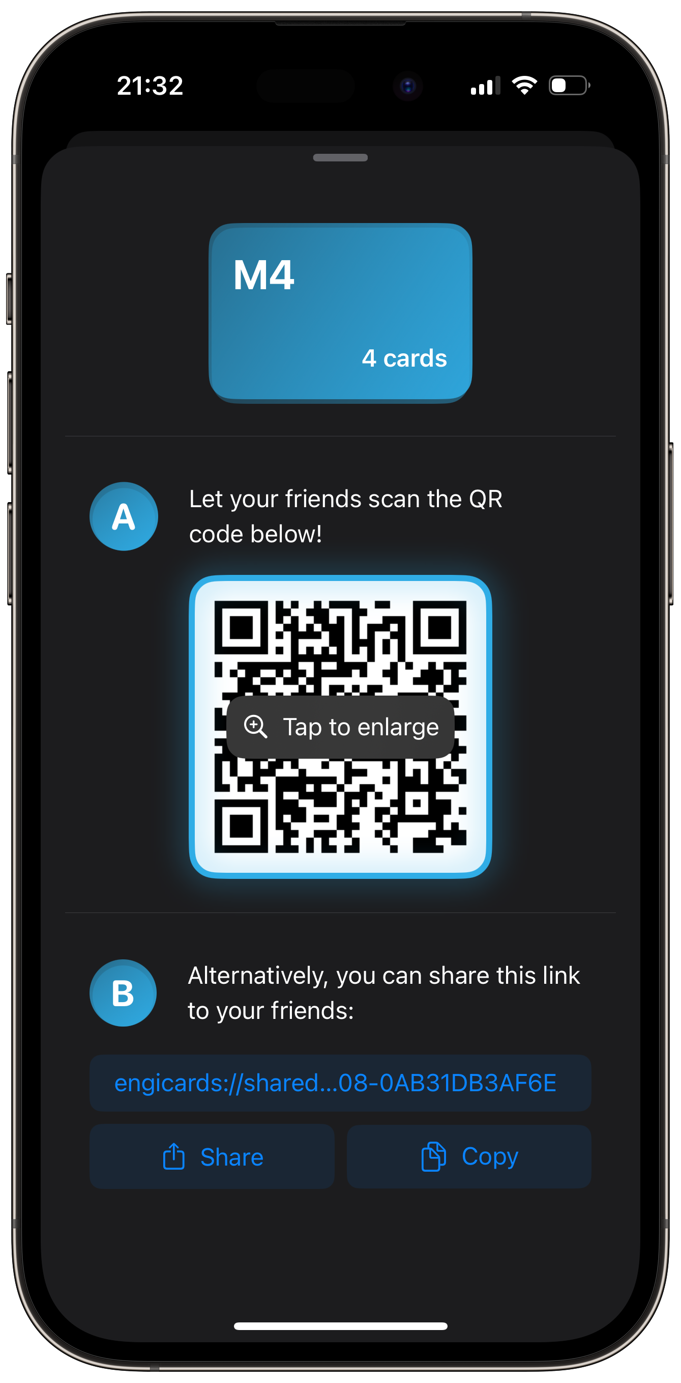 Easily share your decks with friends or classmates via a QR code or a direct link.